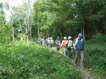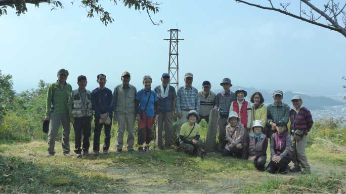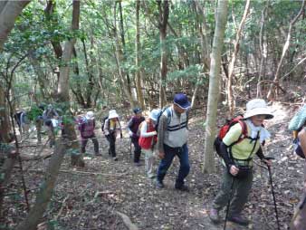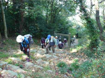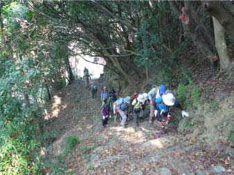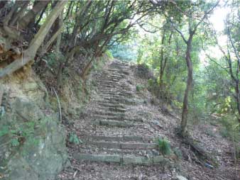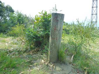 | その山道は、直登の道でしばらくその急登を登ると広い林道に出る。林道は大きくジグザグについているようだ。途中には、名草小学校へ下る分岐や内原神社への分岐がある。林道を大きく回りこんで進むと右に山頂への案内が立っている。結構急な坂道を頑張って登り切ると山頂に到着する。 | ||||