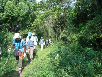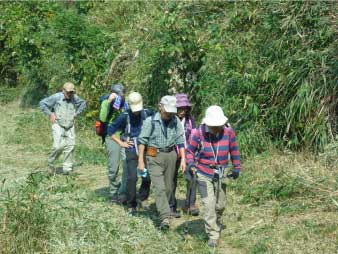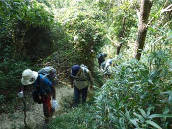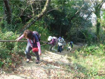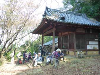 | 石段を登り切ると弁財天に到着、小休止をとり、右隅の鉄塔横からいよいよ山道に入って行く。わずかに踏み跡がある程度で余り歩いていないような道だが草刈もされていて全く問題のない道だ。名草山には毎日登山などが行なわれているようでたくさんの登山道がある。そんなわけで紀三井寺の入山料までだして登ってくる人は少ないのだろう。我々のようにお寺参りも兼ねて登る人が使う道のようだ。 | ||||