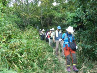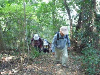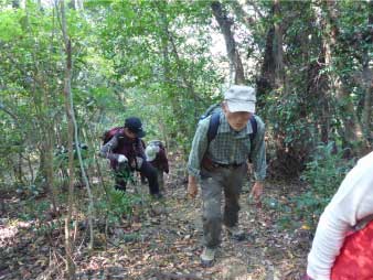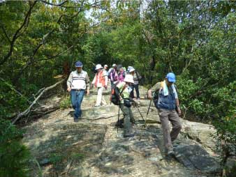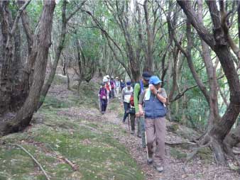 | 山頂から下り登ってきた林道を少し戻り、内原神社へと下った。少し下ると展望台があり、片男波が見えたが益々霞んできていた。どんどん下るが少し急な下りのようだ。やがてマリーナ台という展望所に着くが今日はだめだ。 下りはやはり厳しそうで所々に露岩の道もあった。あと少しというところで最年長の人が前のめりに転倒、、少しすりむいた程度で事なきを得た。登り時は息遣いとか歩き方とか見て慎重に登っていたが、下りで転んでしまって大反省だ。 |