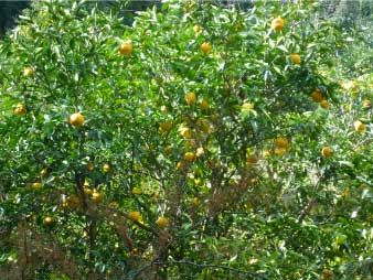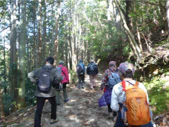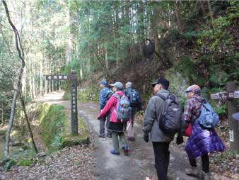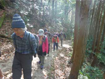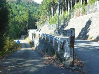 | しばらく歩くと以前に行ったことのある明智越えからの道の分岐を過ぎる。この辺りから道は少しずつ急になってくる。やがて前方が開けて柚子畑が見えてくる。 | ||||