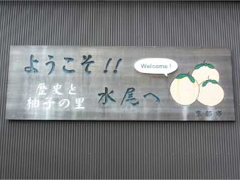 | 再び樹林の道を登って行くとやがて集落が見えてくる。柚子の里水尾だ。遊歩道から府道に上がると建物の壁に「ようこそ!!歴史と柚子の里 水尾へ」の京都市の案内がある。 | ||||