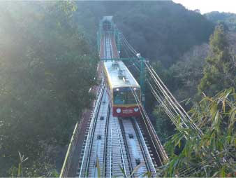| ガラガラと音がしてきた。ケーブルカーのロープと輪の回る音だ。上のトンネルからケーブルカーが下ってきて足元のトンネルから登りのケーブルカーが出てきて登って行った。近くには寒桜だろうか小さな桜の花咲いていて心を和ませてくれる。 |