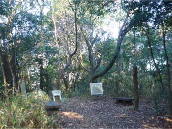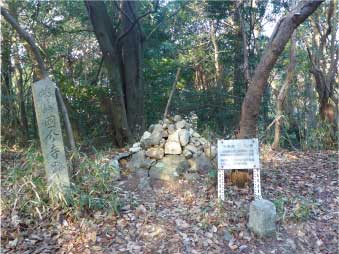 | 鳩ヶ峰は、標高143mで二等三角点になっている。展望は雑木林の中で残念ながら望めない。三角点横に石柱が立っていて「鳩ヶ峰国分寺跡」と刻まれていた。 |