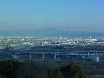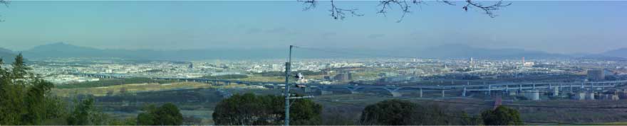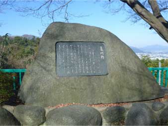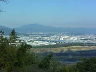 | 展望台は塔が建っているのかと想像していたが尾根頭が自然の展望台になっていた。愛宕山、京都市街、比叡山、宇治市街と山々そして三川合流、背割り堤などが一望できる。片隅に、谷垣潤一郎文学碑「蘆刈抄」があった。 |