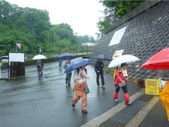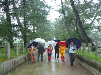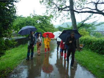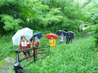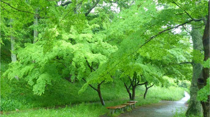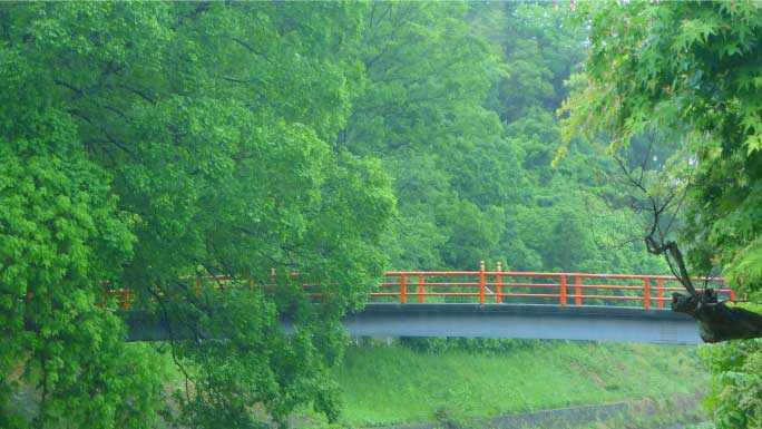 雨に包まれたイロハモミジは、やわらかく、朱色の橋は緑にとけこんで素晴らしく幻想的だ。公園途中の東屋で昼食にした。昼食後も、素晴らしい新緑を楽しみながら竜田川に沿って歩いた。秋の紅葉は想像するだけで素晴らしさが伝わってくる。 |