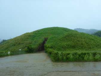 | 法隆寺から10分ほど歩くと開けたところに、藤ノ木古墳が現れる。藤ノ木古墳は、古墳時代後期の円墳、直径50m、高さ9mだ。見学用石室入口から覗いてみたがよく分からない。少し藤ノ木古墳について知りたくなったので近くの斑鳩文化財センターへ行った。 |