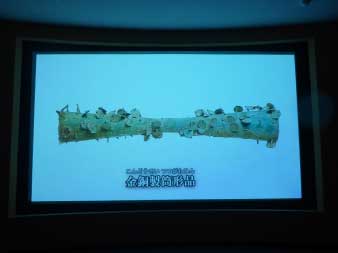 | 斑鳩文化財センターには、藤ノ木古墳より出土した代表的な副葬品のレプリカが展示されている。副葬品を見る前に20分ほど藤ノ木古墳について、発掘時の様子などをまとめたビデオを見た。そして副葬品を見ると、6世紀後期の素晴らしい技術に感慨深いものがある。昔の人は偉かった・・・。 |