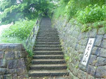 歌碑の左側に石段が続いていて「みむろやま」と彫られた登山口がある。ここから数分で山頂だ。 |