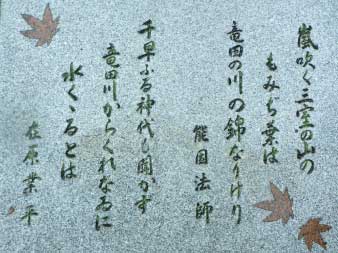 登山口の辺りは石垣になっていて歌碑が石垣に嵌め込まれている。「嵐吹く三室の山の もみじ葉は 竜田の川の錦なりけり」能因法師、「千早ふる神代もきかず 竜田川からくれなゐに 水くくるとは」在原業平。