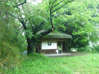 登山道の脇には桜の古木がたくさん植わっている。春には山全体が桜になると言われるくらいの桜の名所だ。山頂には東屋があってちょっと茶室を連想させる建物だ。