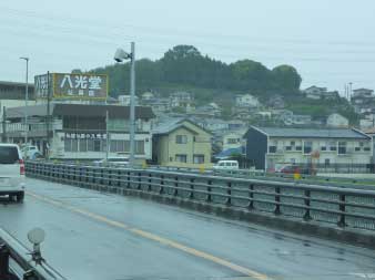 三室山西斜面の住宅街を下ると国道25号に出る。大和川にかかる昭和橋を渡る、川の流れは雨のためか増水して濁っている。途中で振返ると低い建物の陰になりそうな三室山が見える。 |