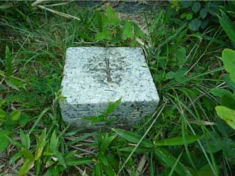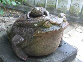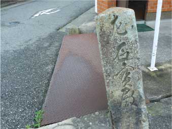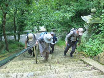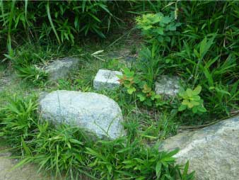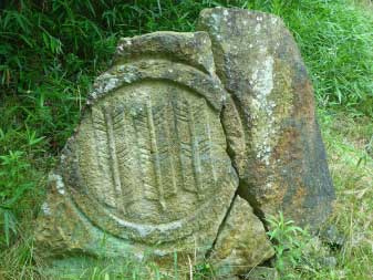 | 生石橋に戻り、再び生石神社鳥居に戻った。鳥居の脇に家紋石、三本矢があった。この家紋石は元々観濤処近くにあって風化し始めたのでここへ移動したそうだ。鳥居から急な石段を登りきると、生石神社に到着。 |