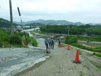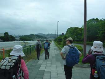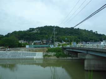 | 高砂市総合運動公園を過ぎると正面が開け、川があり橋が架かっている。川は法華山谷川で橋は、生石橋だ。川の向こうにこれから登る竜山の採石場の絶壁が目に飛び込んでくる。橋の向こうには石の宝殿の宝殿山が見える。 |