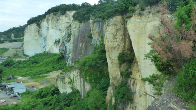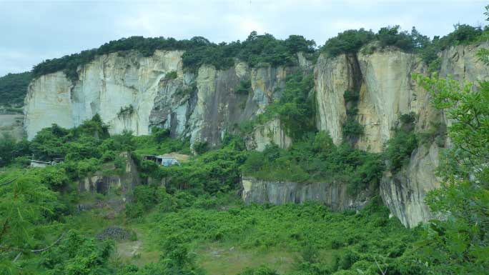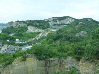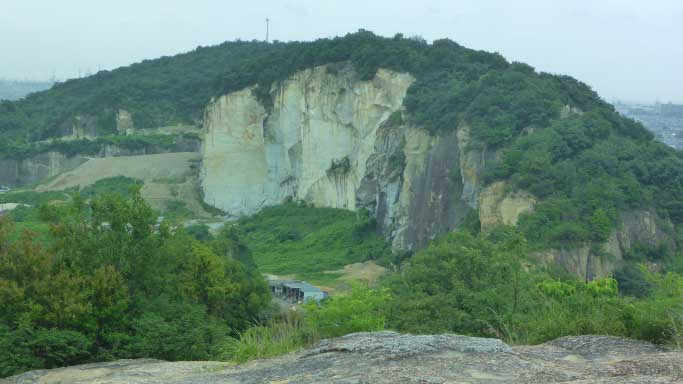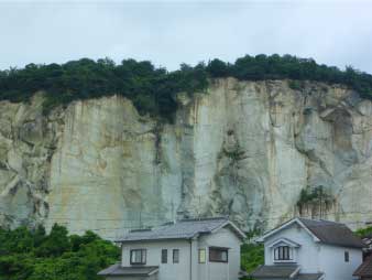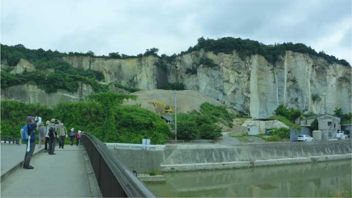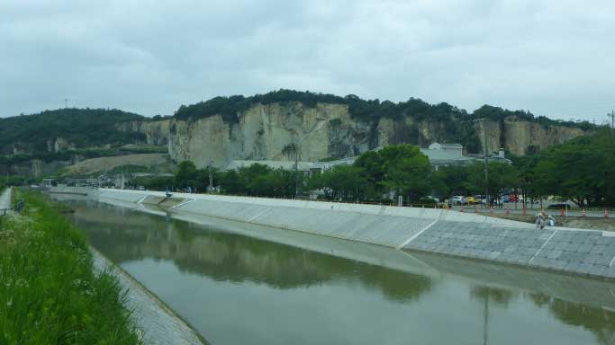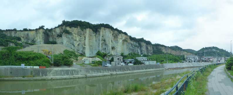 | 石切場入口に降り、橋を渡らって振り返ると竜山の荒々しい砕石の壁が山の断面を現している。そんな景色を見ながら公園横の歩道を生石橋へと進む。 |