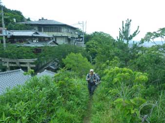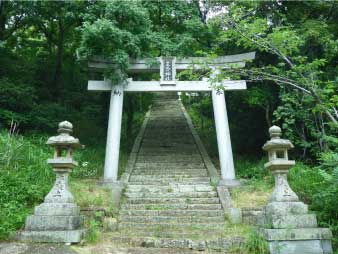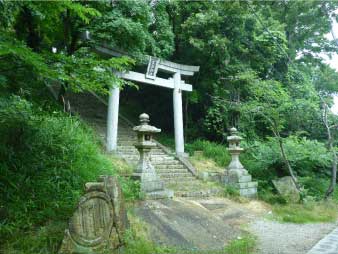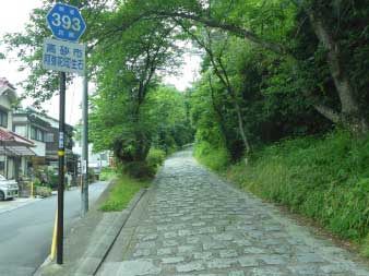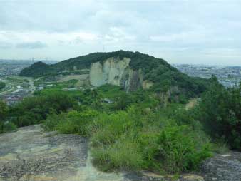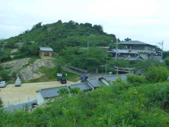 | 生石橋を渡り山裾の突き当たりまで歩くと、左折になり、石畳道の県道393号になる。石畳を少し登ると鳥居があり生石神社(おうしこじんじゃ)だ。雨が迫っているので生石神社を通過して先に竜山に登ることにした。坂を登っていくと左手に竜山の砕石跡がそびえている。 |
