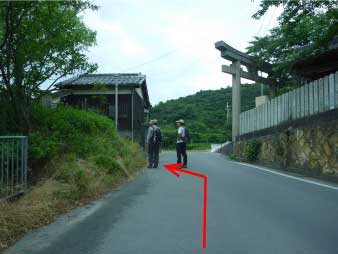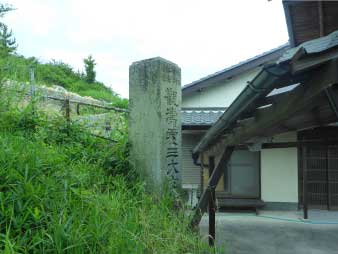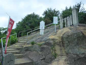 | 竜山の登山口は坂を登りきった右に生石神社の鳥居、左に民家がありその左側から尾根に取り付く。尾根道の右横の登り口に観濤処三大宮碑が建っている。 |