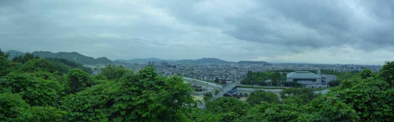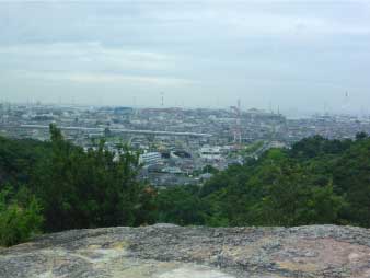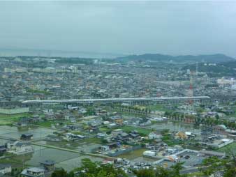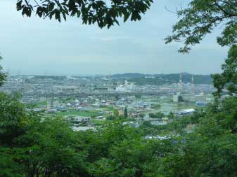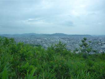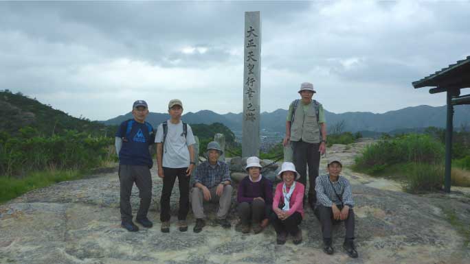 | 宝殿山は、標高64mで象の背中のような広い山頂だ。山頂には、大正天皇行幸之碑が建っていて、横に東屋があり休憩所になっている。展望は素晴らしく360度の絶景だ。ここは夜景鑑賞のスポットにもなっているようだ。 |