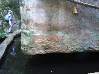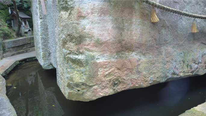 生石神社は、石の宝殿と呼ばれる巨大な石造物を御神体としている。石の宝殿は、横6m余り、高さ6m弱、奥行7m余りの四角い石で、水面に浮かんでいるように見えるため、浮石とも言われる。。 |