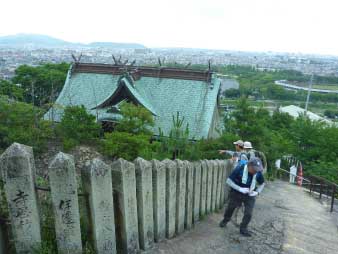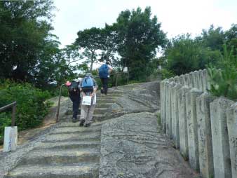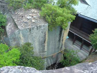 | 生石神社のお参りして、山頂公園、宝殿山山頂へと石の宝殿の左側から登っていく。山頂まで石段が刻まれているが、本当かどうか分からないが山全体が一枚岩で出来ているとか。それで石段は岩を削って造られている。少し上がったところから石の宝殿を見ると、宙に浮いて見えるのがよくわかる。あっという間に山頂に到着。 |