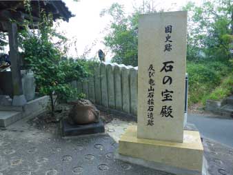 石の宝殿(中腹)と「ふれあいの郷 生石」のモニュメント |