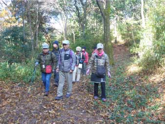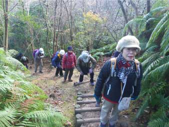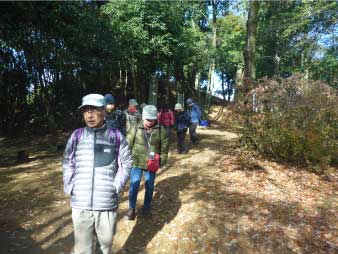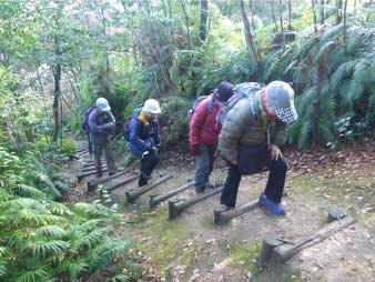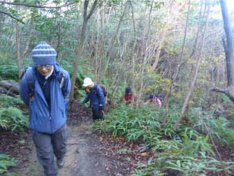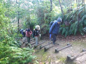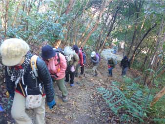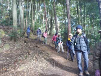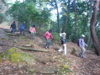| 一の丘をあとに少し急な坂を注意しながら下ると鞍部に出てここから少し登り返す。二の丘からたくさんの幼稚園児が下てきた。お年寄り組も頑張らなきゃ。 |