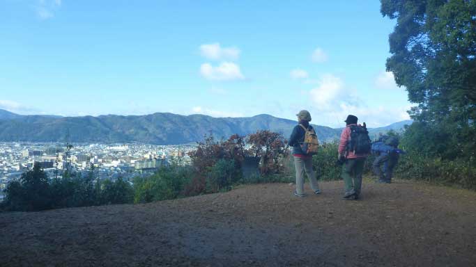 | 妙心寺の北門から出て西に折れ、雙ヶ丘登山口へ向かった。登山口からいきなりの急登でちょっと気を入れ直して登った。10分足らずで山頂に到着した。 |