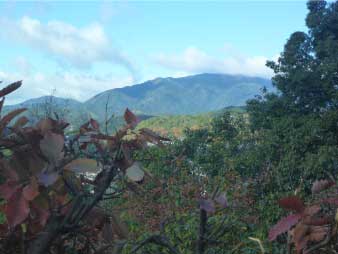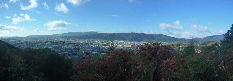 | 雙ヶ丘は、一の丘が標高116mで、三等三角点になっており、二の丘、三の丘と南北に続いた低い山だ。西側の展望が素晴らしく、釈迦岳、ポンポン山から小塩山の連山、嵐山から愛宕山が望める。北側の木の間から仁和寺と北山を望むことができる。 |