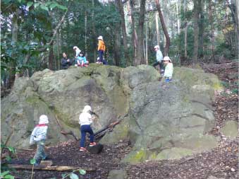 | 二の丘山頂手前の木の隙間から比叡山が美しく見える。二の丘は、標高102mで広い山頂になっている。二の丘を下り始めるとまたにぎやかになってきた。幼稚園児が3mほどの岩場を登ったりして遊んでいる。賑やか賑やか、大人だと6、7mの岩場になりそう簡単に登れそうもない岩だ。 |