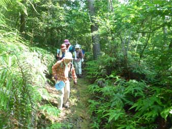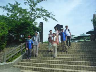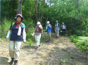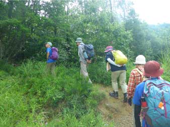 | 7月13日、松愛会山歩き会で舎羅林山に登り、妙見の森へ移動し、BBQを行った。能勢電平野駅を9時前に出発、共立平野病院の横を通って、住宅街の急坂を登っていく。突き当たりの石段を登り詰めると登山口になる。急坂の住宅街は、毎日のお出かけや買い物をどうされているのか少し気にかかる。 |