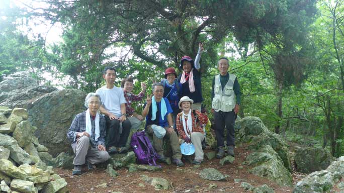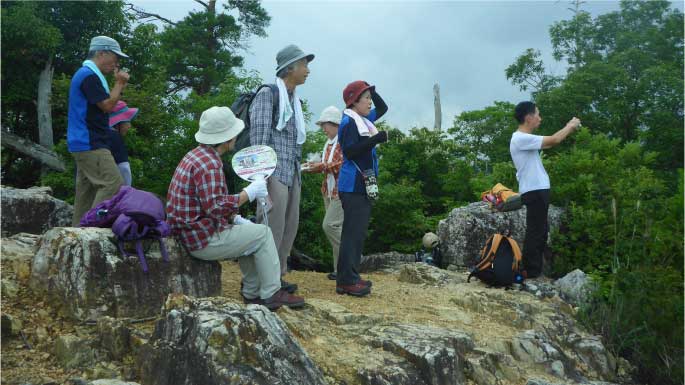 | 展望岩に立つと、これから登る舎羅林山の山頂が見える。山頂からの展望は素晴らしく、大船山、三草山、雨森山、剣尾山、高代寺山、妙見山などの山並みを望むことができる。ゆっくり展望を楽しんだあと、山頂へと向かう。 |