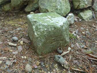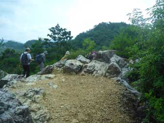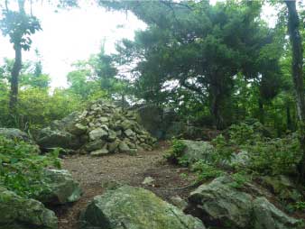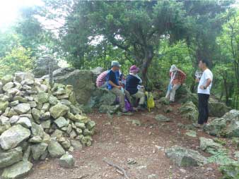 | 舎羅林山は、標高265mで三等三角点になっている。山頂には展望台のような岩があり、三角点横にはハイカーが積んだのだろう、小さな石が積まれている。残念ながら展望は望めない。山頂でしばらく休憩して下山開始、気温、湿度が高く熱中症になりかねないので早めに下山した。 |