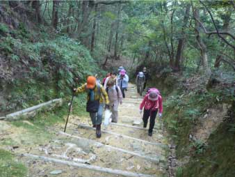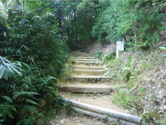 | 登山口を入るといきなり階段道になり山登りが始まる。この道は、東坂参道で1丁登ると、丁石がある。この丁石は、円教寺山門の十八丁まで続いているので、登りの励ましになる。 |