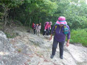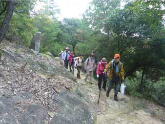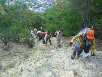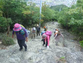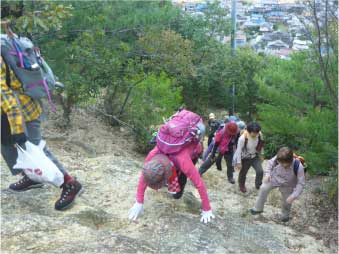 | 二丁から岩登りになり、低山なのにすごい山登りをしている雰囲気になってくる。五丁には展望所と羅漢岩がある。展望所から姫路市街のパノラマが楽しめる。 |
