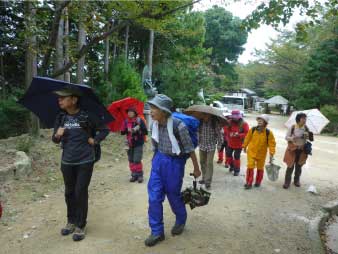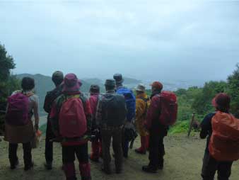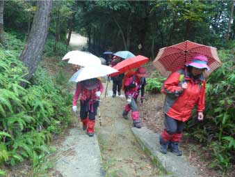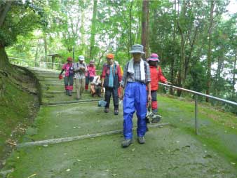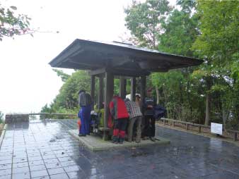 | さらに登ると、紫雲堂跡展望広場に着く。広場の東屋に入ると小雨が降ってきた。少し早いが昼食のタイミングや場所がお寺の境内になり難しくなるのでここで早めの昼食にした。昼食後、傘でもいけそうだが雨具を取り出して着ることにした。 |