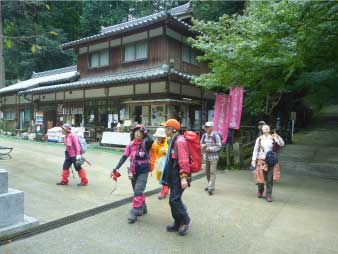 予定のバスに乗り、書写山ロープウエイ前へ狭い道をくねくね曲がって行く。終点でバスを降り、支度をして書写山へと出発。