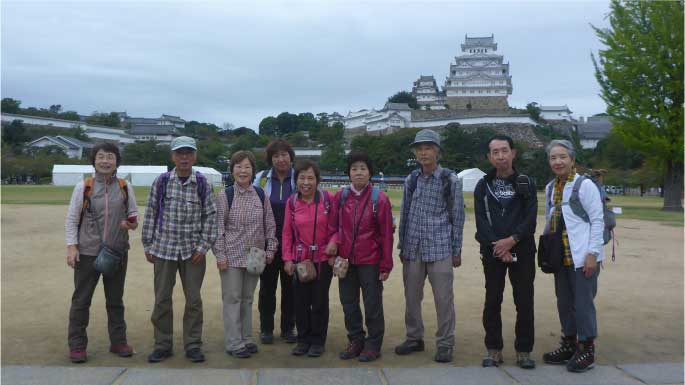 | 大手門前でバスを下車し、手門を入ったところで姫路城を遠くから眺めた。登城は別の機会にして姫路駅へ戻り、帰阪した。少し早く大阪に着いたので反省会を行いその後解散した。みなさんお疲れ様でした。 |