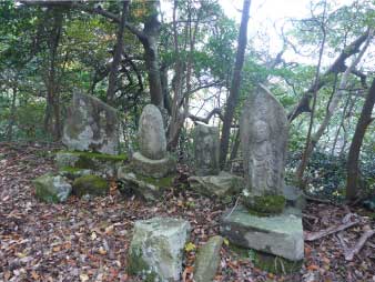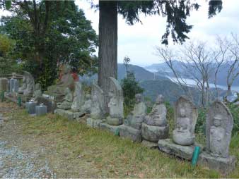 愛宕神社を過ぎると尾根道になり、緩やかなアップダウンのある登りになってくる。登山道の左右に、四国八十八札所の石仏が立ち並んでいる。山頂へは札所番号を遡っていく感じで、何番まで来た何番まで来たと言いながら道すがら登っていく。