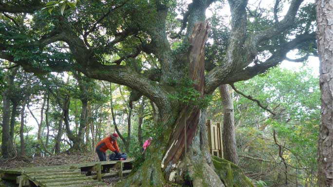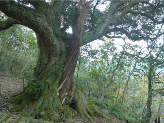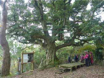 | 尾根道を快適に進み、かなり長い急な石段を登りきると、和合の樹に着く。アカマツとコジイが根元から一本の樹のように合体していたので「和合の樹」と名付けられ地域のシンボルになっていたそうです。現在はアカマツが枯れコジイに巻き付かれたような状態になっている。 |