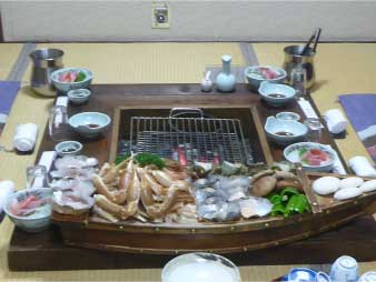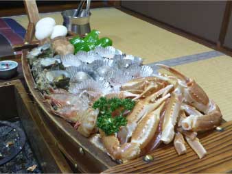 | 一息ついて外湯巡りに出発御所の湯と一の湯に浸かってゆっくりした。旅館に戻り今日のメインイベントカニの囲炉裏料理でお腹満腹、至福のひとときを過ごした。 |