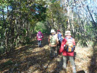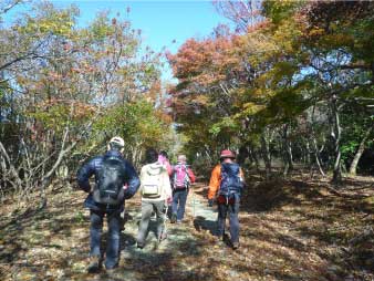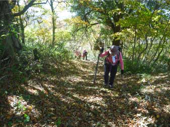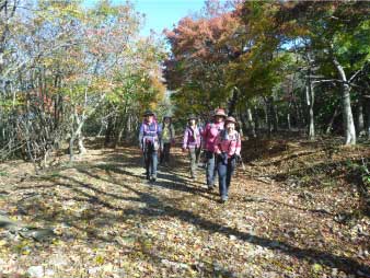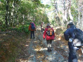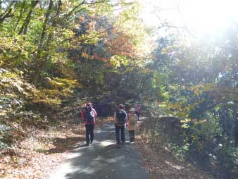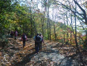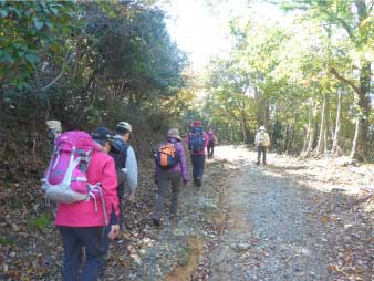 林道をひたすら歩き緩やかに高度を上げていく。周囲の紅葉は美しく落ち葉を踏みしめ登った。山頂付近で林道歩きも飽いてきたので斜面の急な登山道を少し登り、また林道に出る。林道に出ると山頂の大広場に出る。 |