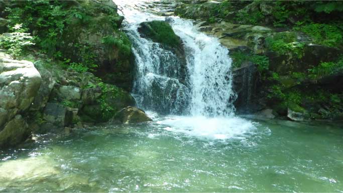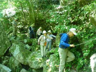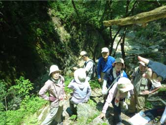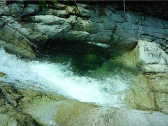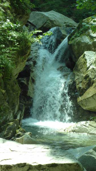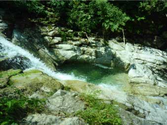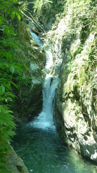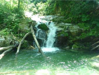 | 魚止ノ滝に到着、滝の近くまで行ってマイナスイオンを楽しんだ。ここから先少し危険なので行くのを自粛した。この先には、障子ヶ淵、唐戸ノ淵があり、右岸の斜面を登りきると大摺鉢へと続いている。 |