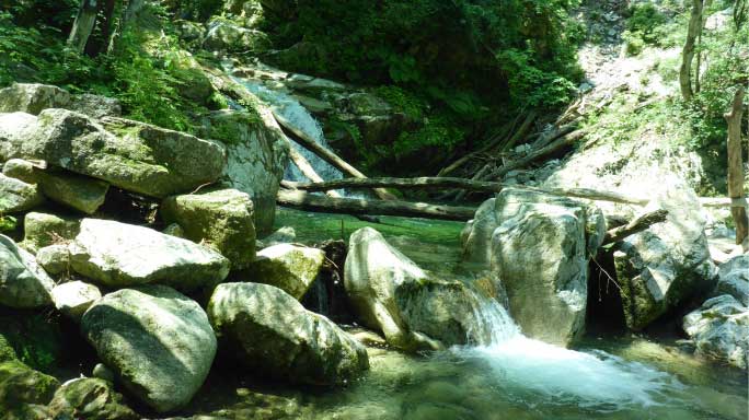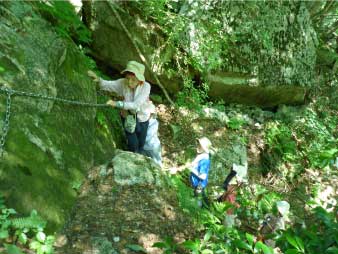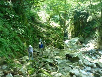 | 左岸沿いに上流へ登っていく、クサリ場などがあり、少しトリッキーになる。そんなところをしばらく登ると左奥に滝が見えてくる。 |