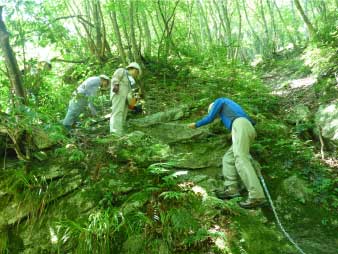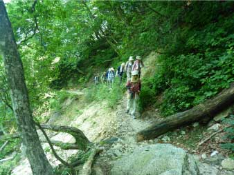 | 魚止ノ滝から往路を戻り、右岸に渡渉して分岐に戻った。大摺鉢へと登っていくが登山道のメンテナンスがあまり出来ていないようで倒木もあり、崩れかけているところもある。 |