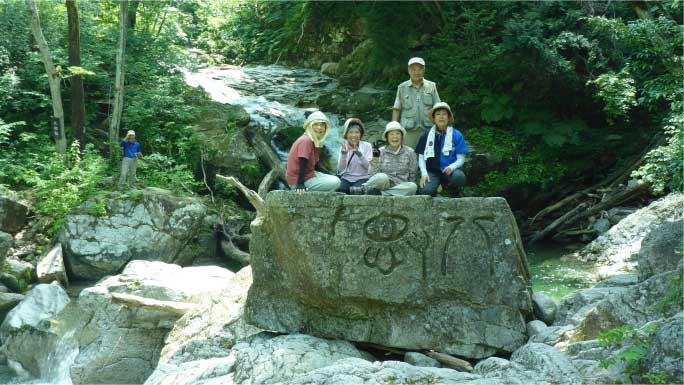 | 大摺鉢に戻り、「八徳」と刻まれた大岩の周りでゆっくりくつろいだ。「八徳」の元字は大正11年、現地を訪れた堀田知事が書き込んだものといわれている。淵には、倒木が散乱していて素晴らしい景色は台無しだ。 |