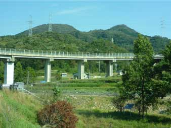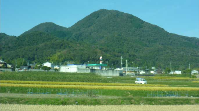 | 田んぼ道を太子温泉へと下っていく。川沿いに出たところで振り返ると、二上山が河内グリーロードの上に見えていた。 |
