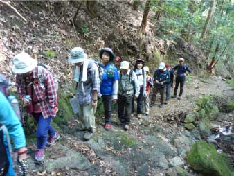 | ここで休憩して、馬ノ背を目指して沢沿いの道を登った。登り始めると露岩の道や木の橋、階段などが続き、少し厳しい登りが続く。約35分、標高差約220mを頑張って登りきり、馬ノ背に到着した。 |