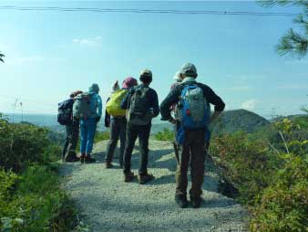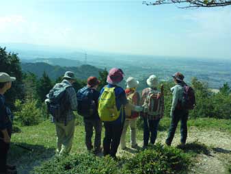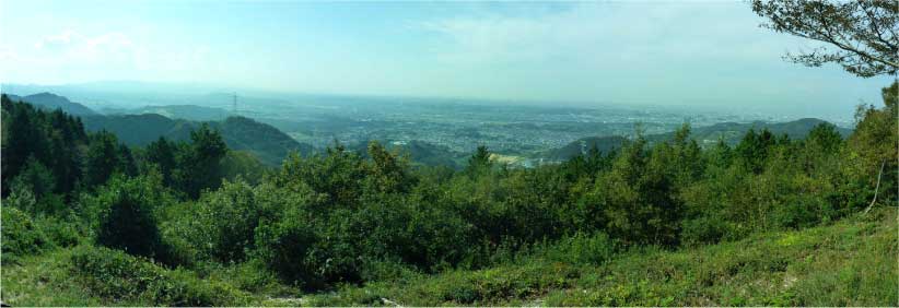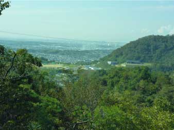 | 雌岳をあとに、太子温泉へと下り始めた。少し下ると展望が素晴らしいピークにつき、大阪平野の大パノラマを楽しんだ。 |