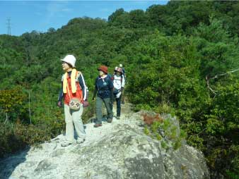 | 道標に沿って下っていくと、やがて露岩のやせ尾根を通る。景色もいいので一休みにする。やせ尾根の先が急な斜面になっていて展望が素晴らしい。 |