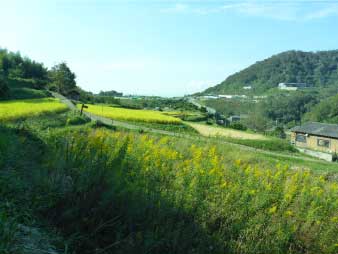 ここから、以前は車道の端を車に注意しながら下ったが印象が良くなかったので、くろわたりの道を下ることにした。 |