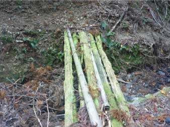 ここから右側の尾根に取付くことになるが、橋が見当たらない。川に5本程の腐りかけた丸太が渡してある。まさかここを渡るのか疑問になる。なぜなら入口の看板、道標とは余りにも不釣り合いだ。